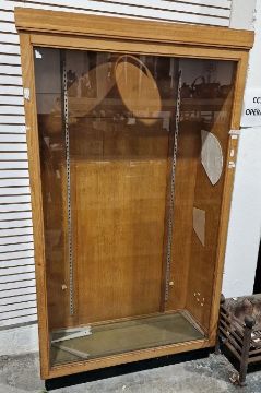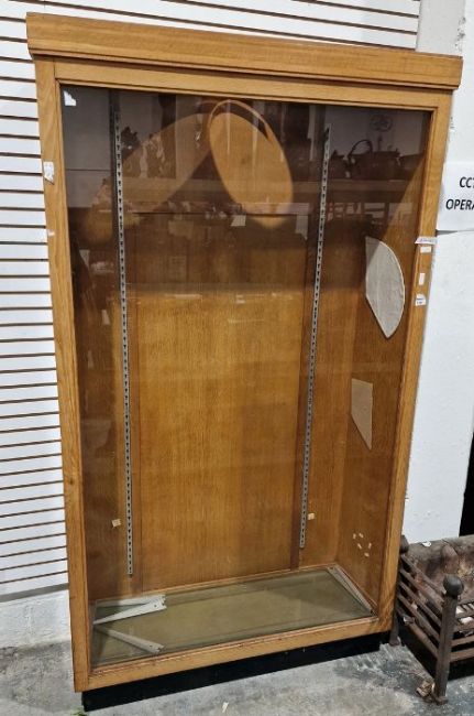 Oak and glazed shop display cabinet on plinth base, 112cm x 193cm