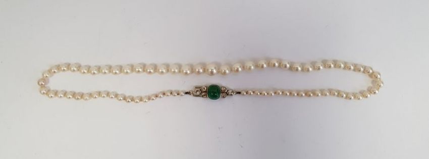 Cultured pearl necklace, single-strand, graduated and the cabochon emerald and diamond set Art Deco-style clasp, the 9mm x 7mm rounded oblong cabochon emerald flanked by two trios of diamonds Condition ReportWe are not qualified jewellers or gemologists, as such we cannot speak about the quality of the diamonds with any authority. We suggest getting your own jeweller/expert or viewing in person.Some pearls with light surface scratches. Emerald with surface scratches, scrapes and knocks.  Possible inclusions and crack. Length approx 43cmLargest pearl approx 8mmSmallest pearl approx 3mm
