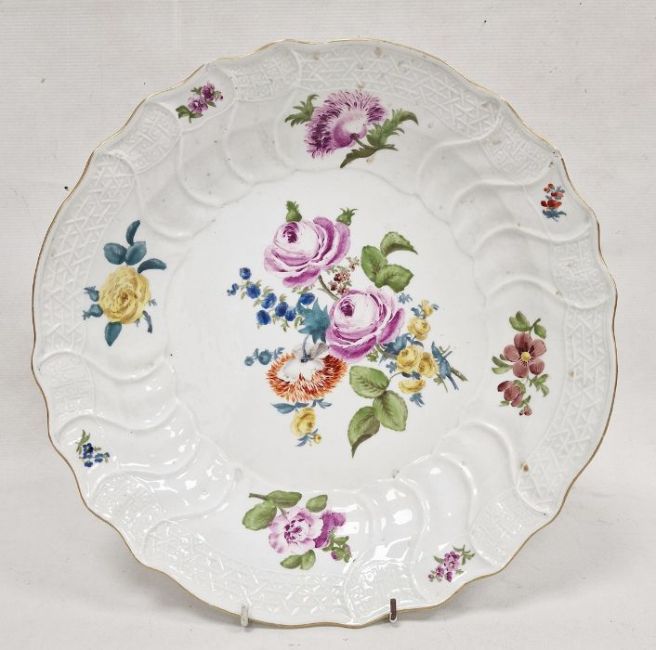 Meissen porcelain charger decorated with naturalistic floral sprays, roses, relief scroll and trellis border, gilt edge, 35cm diameter (some chips)