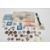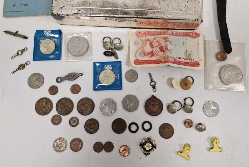Silver-coloured box containing a man's watch, a driving licence book from 1954, assorted coins including foreign currency