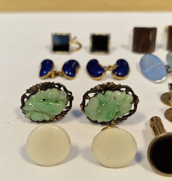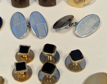 Gent's gold-coloured metal signet ring, 2g approx., pair of blue enamelled gilt kidney bean-shaped cufflinks, other cufflinks and studs