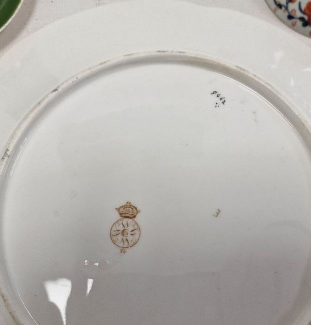 Three 19th century Royal Worcester china dessert plates, floral spray painted with pink and gilt borders, Royal Crown Derby 'Imari' coffee can and saucer, 18th century porcelain tea bowl decorated in imari colours, three pieces of blue and white and two other ceramic items