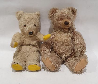 Two mid-20th century golden/blonde straw stuffed teddy bears with felt pads  (One with plastic eyes and one with eyes lost)