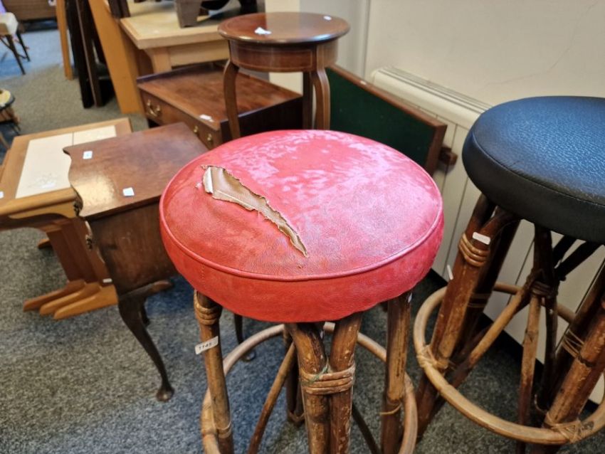 Two bentwood breakfast bar stools with modern upholstered seats (2) Condition ReportThe height is 91cm. One of the red seats underneath the covers has a large split to it, the other has a small mark. There are quite a lot of spots of wear throughout the peice to the legs. A couple of the bindings are coming loose. See attached images.