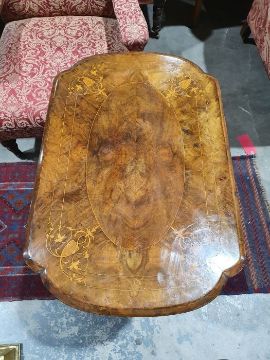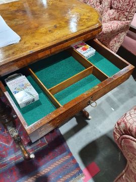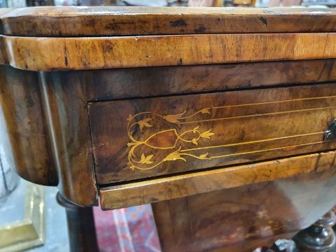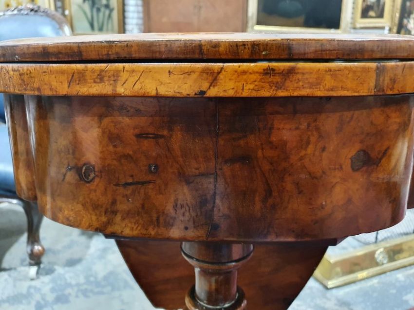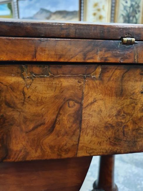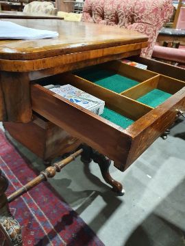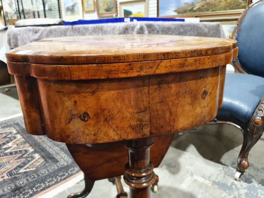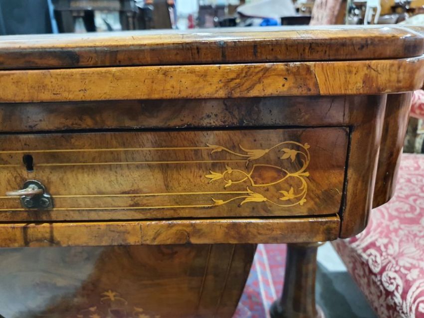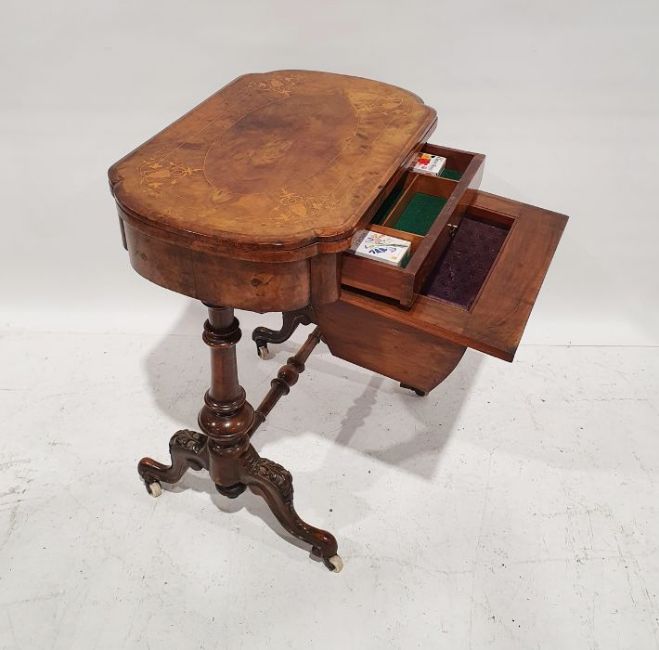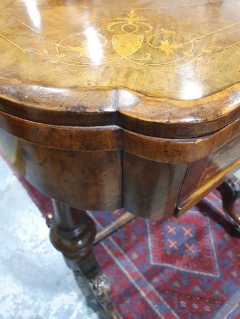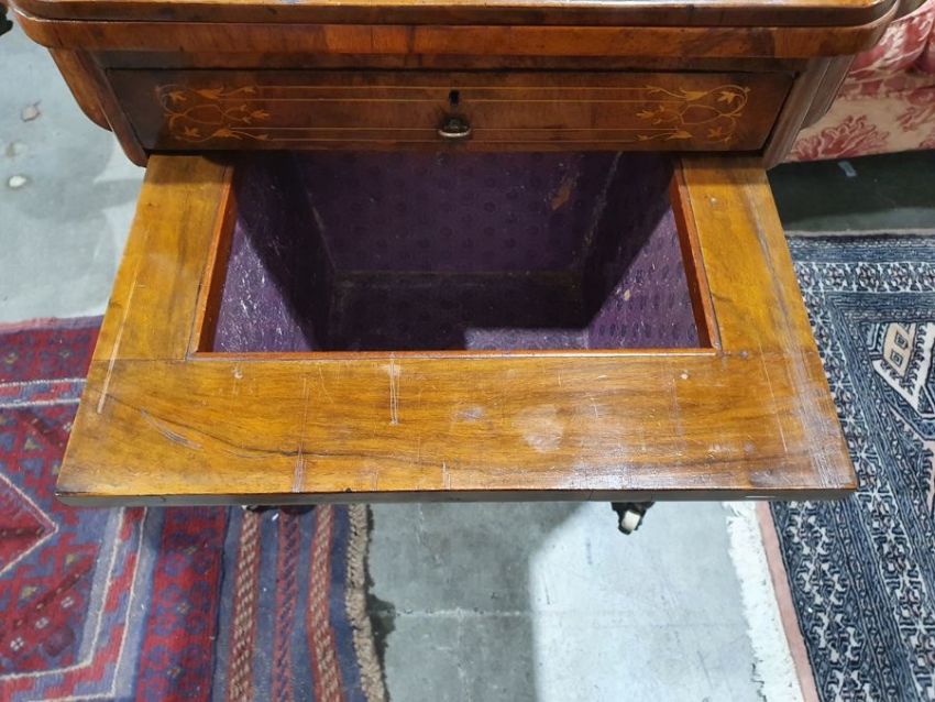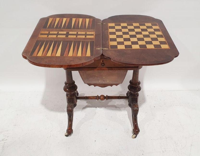 Early Victorian walnut gaming/work table, the lozenge-shaped top with satinwood inlay, opening to reveal games boards interior, above single drawer and work basket, end column, turned column supports united by stretcher, carved ogee legs and white china castors, 72cm x 61cm x 40cmCondition ReportSurface scratches, scuffs and knocks to the wood.  Fading, discolouration and staining in areas. Minor splits to the wood. Some old repairs to the top. General wear and tear.