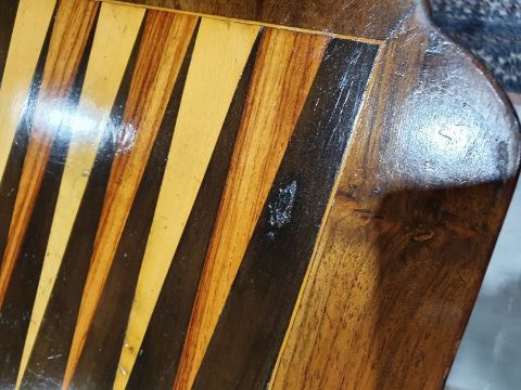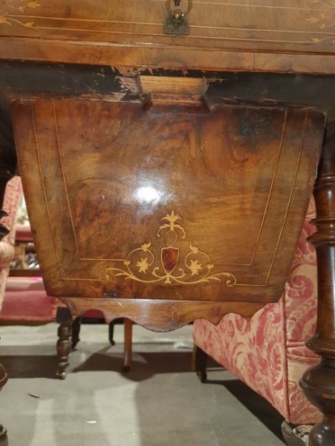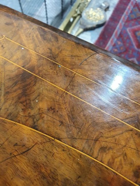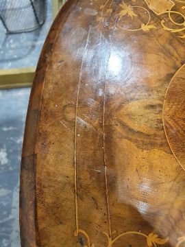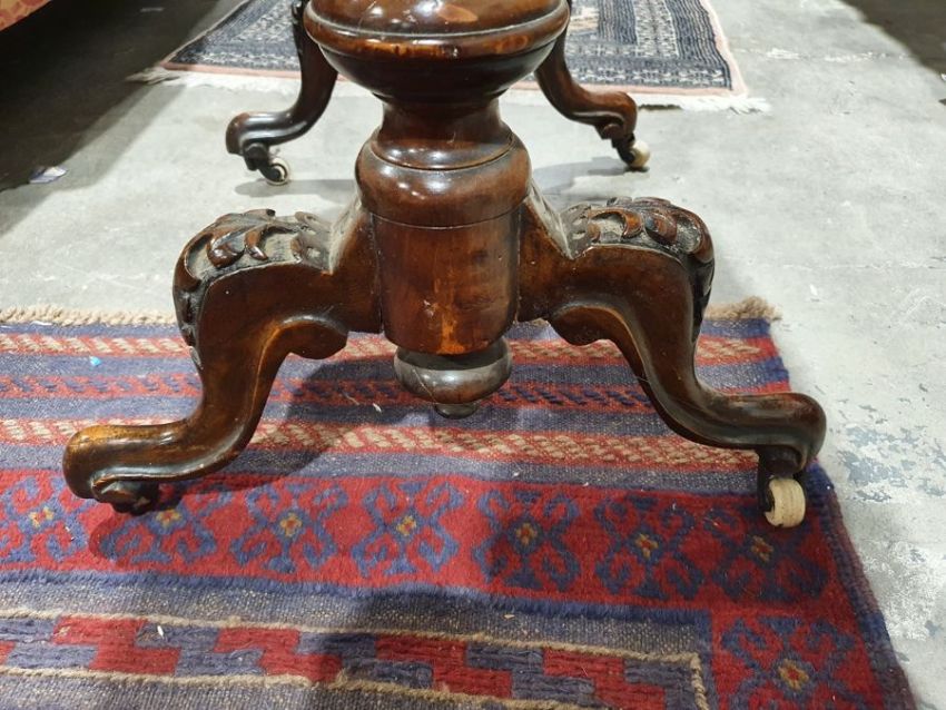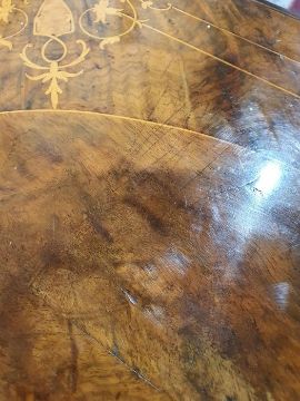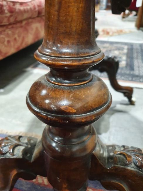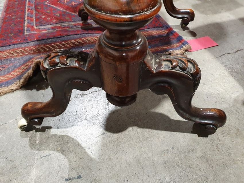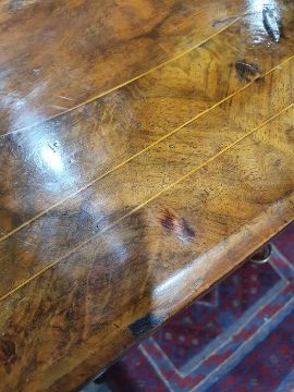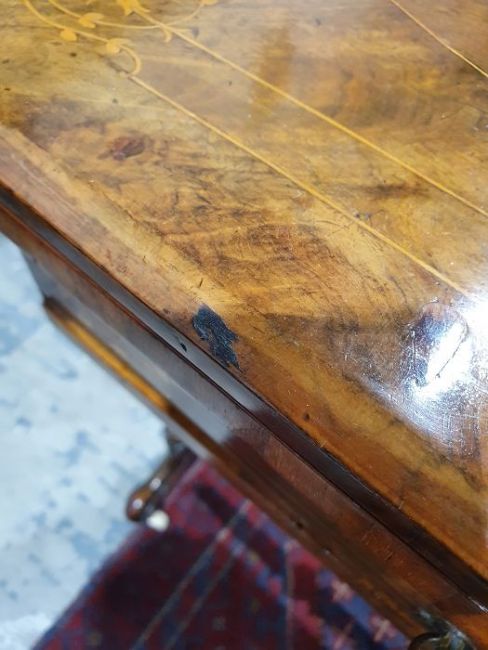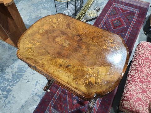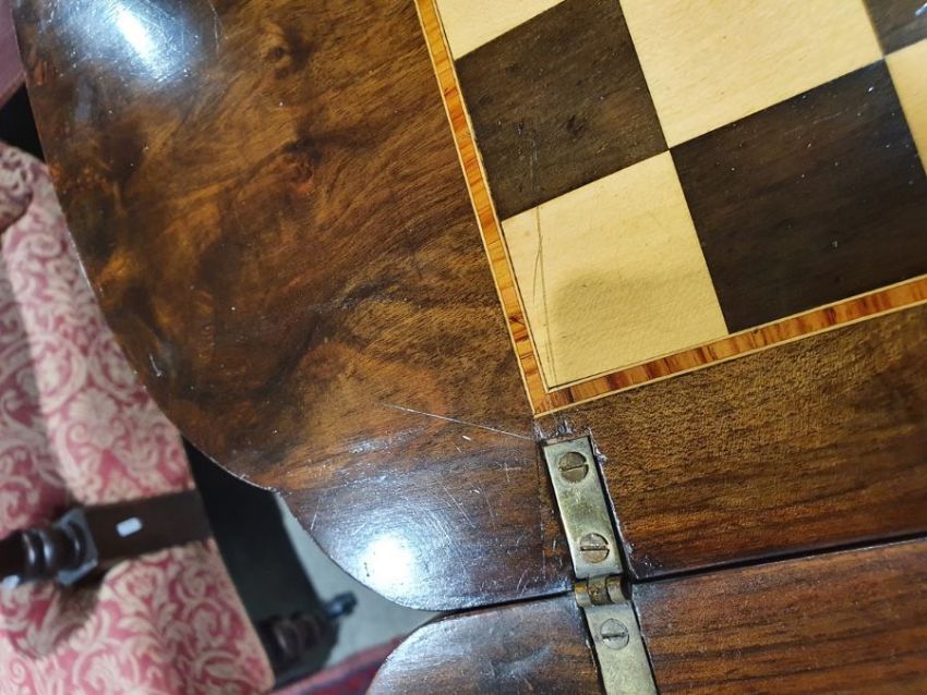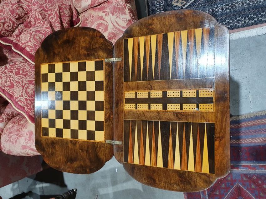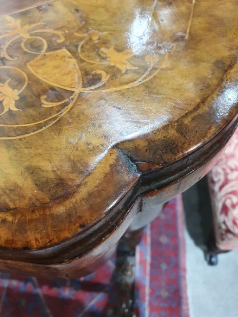 Early Victorian walnut gaming/work table, the lozenge-shaped top with satinwood inlay, opening to reveal games boards interior, above single drawer and work basket, end column, turned column supports united by stretcher, carved ogee legs and white china castors, 72cm x 61cm x 40cmCondition ReportSurface scratches, scuffs and knocks to the wood.  Fading, discolouration and staining in areas. Minor splits to the wood. Some old repairs to the top. General wear and tear.