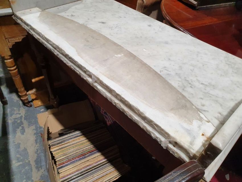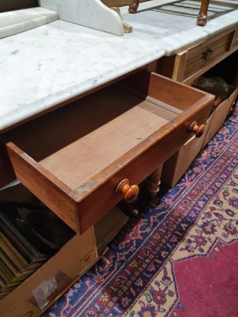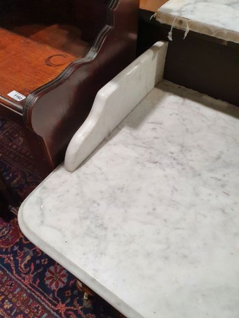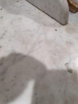 Surface scratches to both marble top and wooden base, scuffs, and knocks. The marble back piece has come off, minor nibbles to the marble in areas. Minor staining and discolouration in ares. General wear and tear.