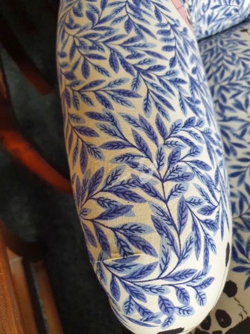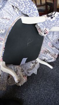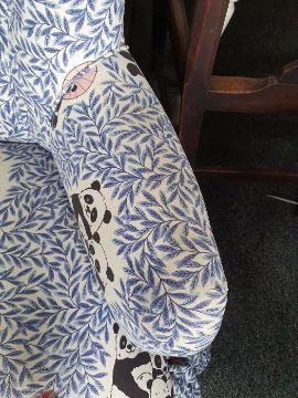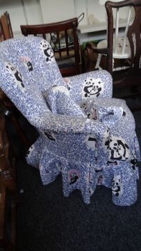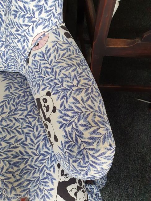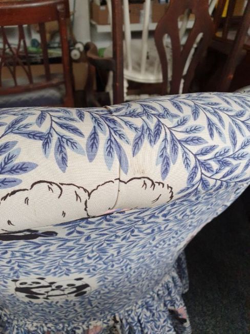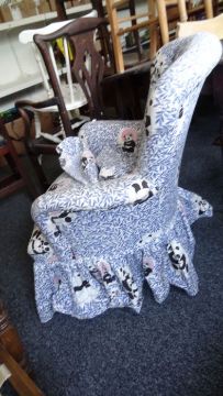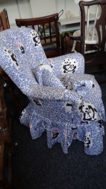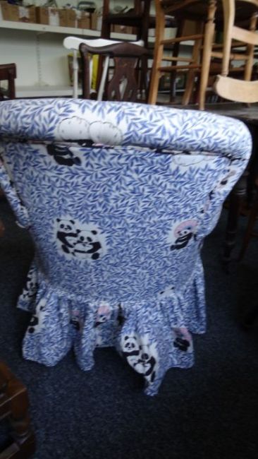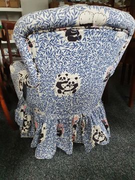 Upholstered reception chairCondition ReportHeight approx 85cm, width approx 70cm, depth approx 78cmUnable to say what colour is/was underneath as it has been fully upholstered in the panda design and is not a cover.  No rips to the material but with some discolouration and staining in places.