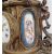 Leroy French bronze and porcelain inlaid mantel clock with eight-day striking movement, the demi-lune case surmounted by classical female, seated, the circular white enamel dial with Roman and Arabic numerals and flanked by pair porcelain panels of cupid with bow, floral porcelain panel to base, the case all embossed with acanthus leaves, strapwork and beading, pair scrolling figure-topped side handles and all on foliate scroll tab feet, 41cm high