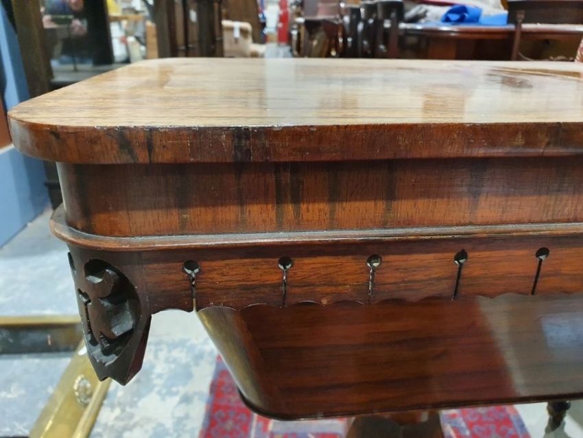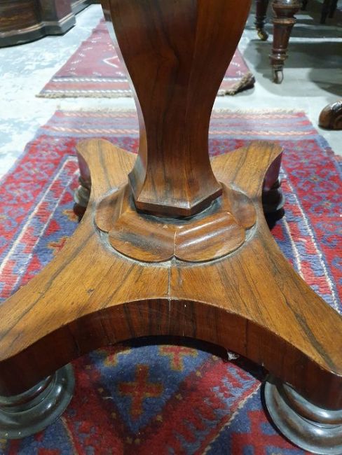 Victorian rosewood worktable, the rectangular top with rounded corners, opening to reveal part fitted interior, on a faceted inverse baluster shaped pedestal, quatrefoil base, turned feet, 71cm x 51cm x 38cmCondition ReportSurface scratches, scuffs and knocks. Fading, discolouration and some staining in areas. Top slightly loose on base. Area of loss to one of the feet. General wear and tear.