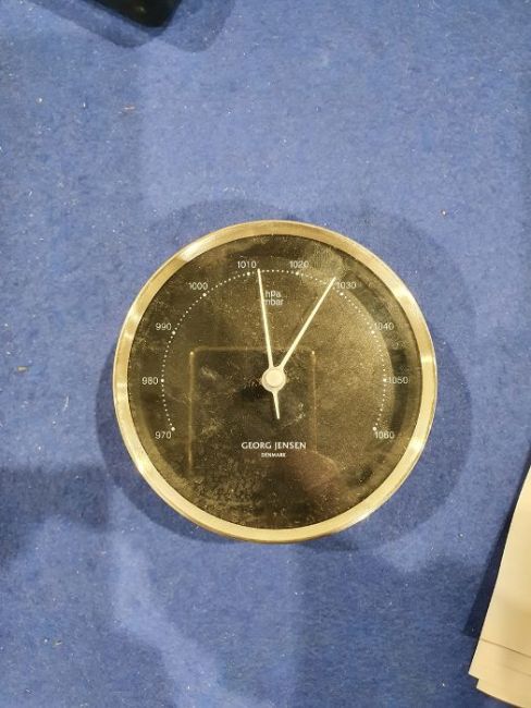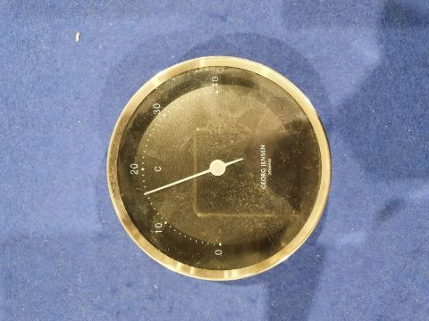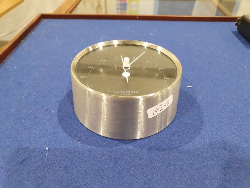 Georg Jensen barometer and Georg Jensen thermometer (9.5 cm diameter) in brushed steel casing and a small quantity of costume jewellery Condition ReportBarometerDiameter approx 10cm, depth approx 4cmThermometerDiameter approx 10cm, depth approx 4cmUnable to say whether in full working order.