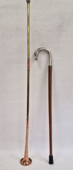 Modern walking stick, the white metal handle terminating in bridled horse's head, together with a copper and brass hunting horn (2)