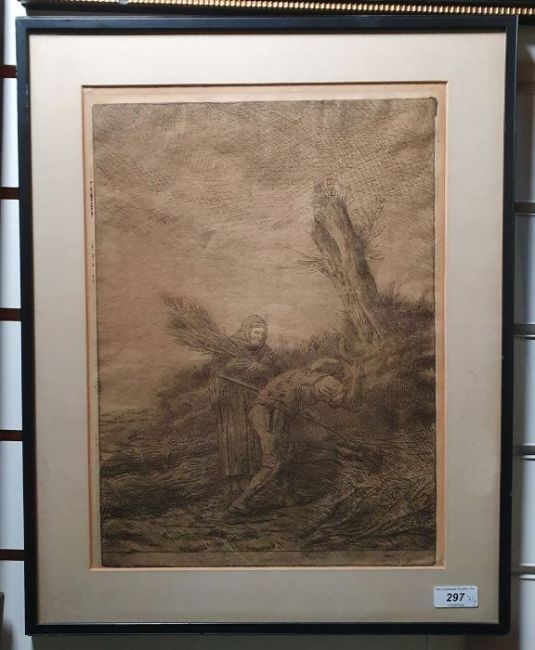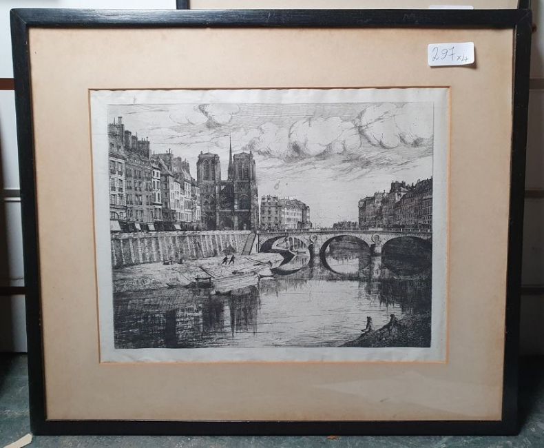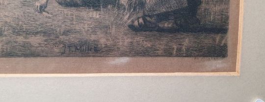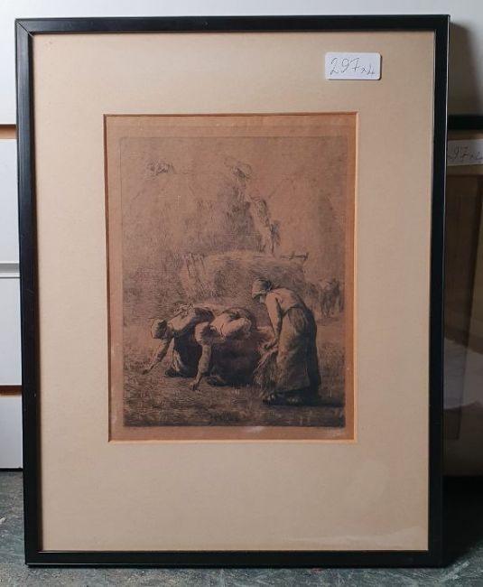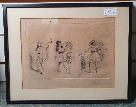 Paul Renouard (1845-1924)DrypointBallerinas, indistinctly signed lower right, 16cm x 23.5cmAfter MilletEtchingThe GleanersAfter H.S HookEtchingRiver and street scene20th century schoolEtching, cutting the wood, indistinctly signed lower right (4)
