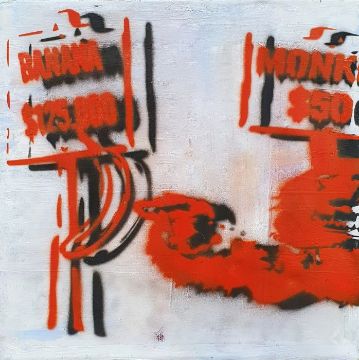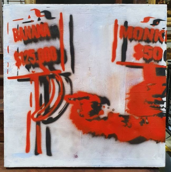 UrbanksyOil on canvasgrafitti-type study with white ground and black and red, 41.5cm x 41.5cm, unframed