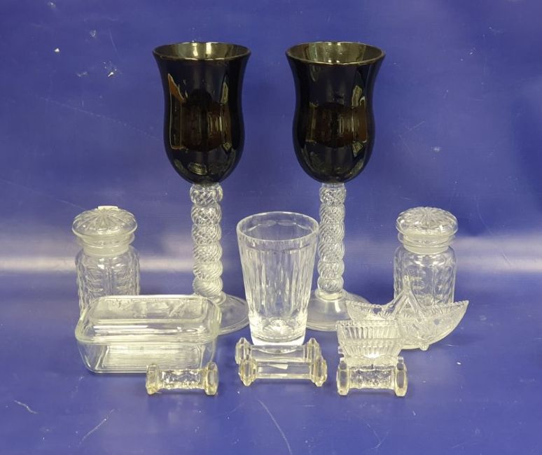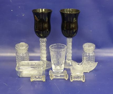 Pair of glass vases in the form of large wine glasses with spiral stems, 35cm, together with assorted cut glass items to include knife holders, vases, butter dish, etc (12)