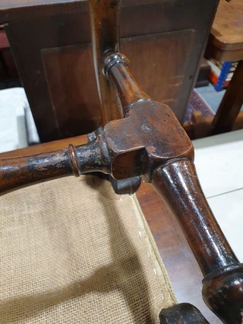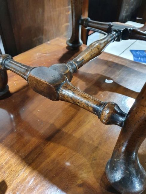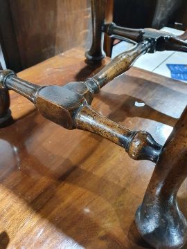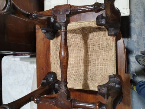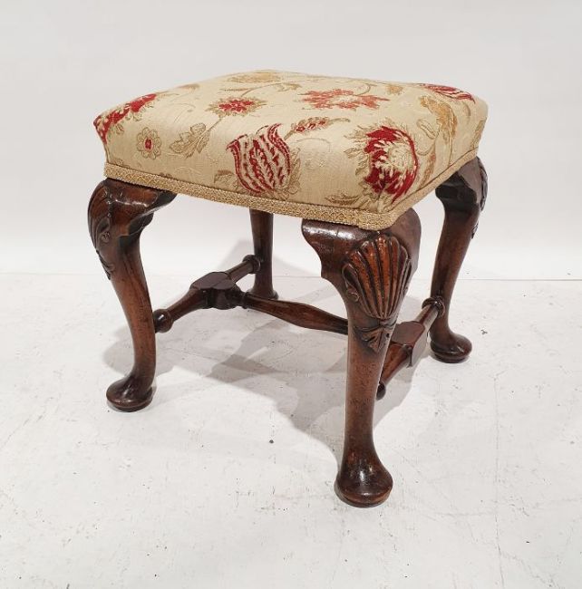 Late Georgian stool, the square top on cabriole legs with shell carving to the knees, turned and stretchered base, 43cm x 41cm x 41cmCondition ReportSurface scratches, scuffs and knocks to the wood.  Areas of fading and discolouration.  General wear and tear, see photos.