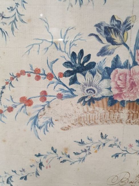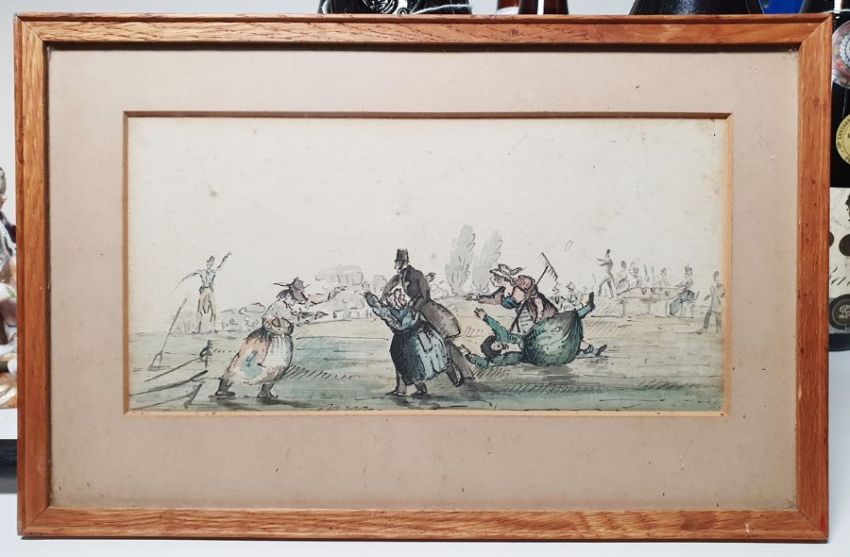 BeilbyWatercolour drawingFlowerpiece, signed and dated '74 lower together with19th century schoolWatercolourHumorous village scene, unsigned (from Barnsley House) (2)Condition ReportFading, foxing and discolouration, folds and creases. Tear to top right, wear  and loss to the paint in places. See photos
