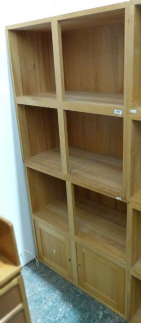 Modern stacking unit of assorted cubes, one with pair of drawers, comprising three larger units, 80cm high x 80cm wide x 40cm deep and five smaller cubes, 40cm high x 40cm wide x 40cm deep (8)