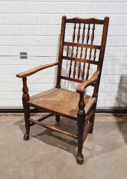 Lancashire-style armchair with spindle back, rush seat, on turned front stretcher