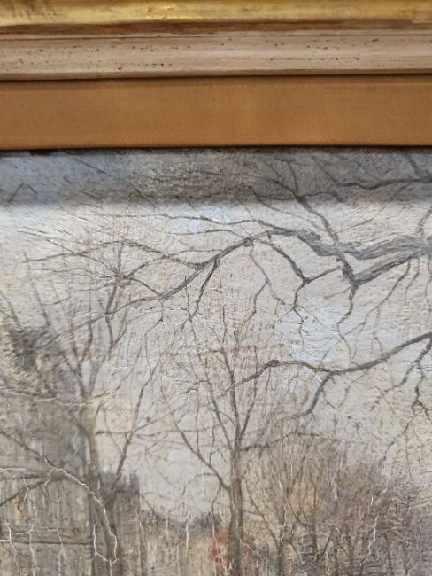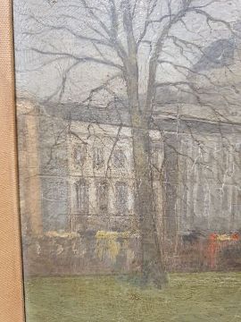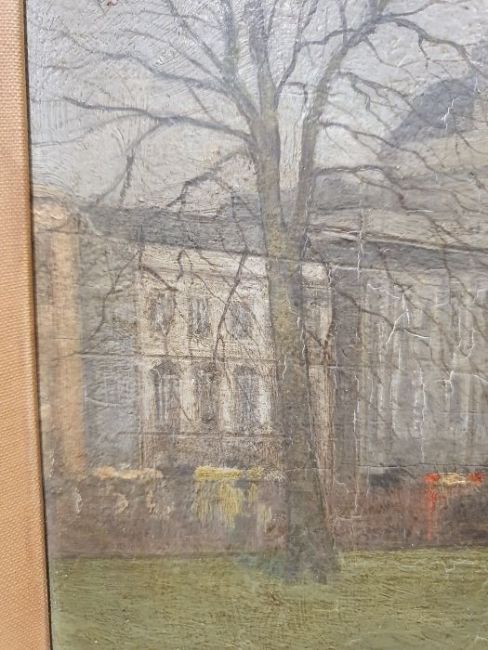 Paul Maitland (1863-1909)Oil on panel“The Green Park, Piccadilly” with woman and child on park bench in foreground, unsigned, with hand written label verso 19cm x 28cmCondition ReportSome surface marks, accretions. Crazing to the paint in places. Possible area of loss to the paint in the top right corner.  Split to the panel in the centre. Possibly areas of fading and discolouration.  Needs a clean. No obvious signs of overpainting or restoration under UV. General wear and tear, see photos.