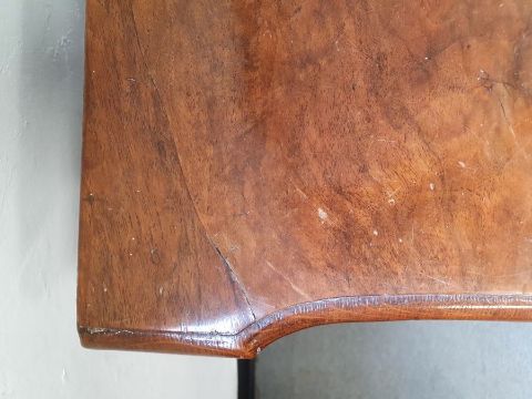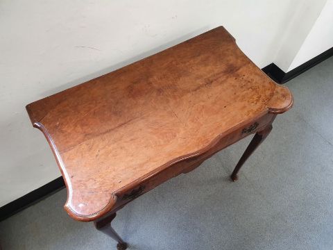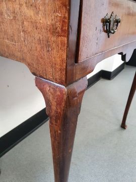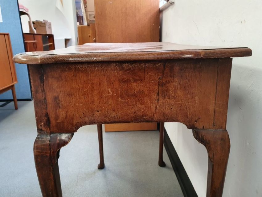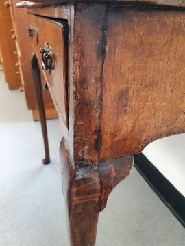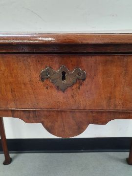 Georgian-style walnut single drawer side table, the shaped top with moulded edge, above single drawer with brass handles and escutcheon, on shaped supports to pad feet, 71cm high x 77cm wide x 42.5cm deepCondition ReportSurface scratches, scuffs and knocks.  Fading and discolouration.  Some splits to the wood.  Top slightly bowed.  Area of loss to one foot. Evidence of old worm. General wear and tear.