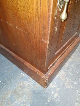 Late 19th/early 20th century oak desk, the leather top above two drawers and two cupboard doors, on plinth base, 75cm x 132cm x 57cmCondition ReportSurface scratches, scuffs and knocks to the wood.  Areas of fading, discolouration and staining to the wood. Leather with scratches, scuffs and wear to the gilt.  Areas of loss to the veneer on the bottom of both pedestals.  General wear and tear.