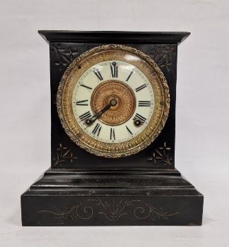 Slate-cased mantel clock with Roman numerals to the enamel dial