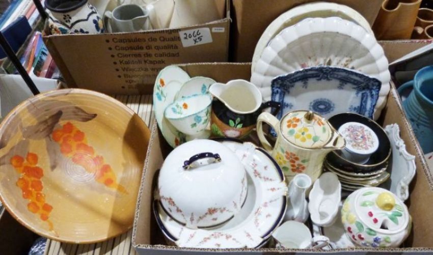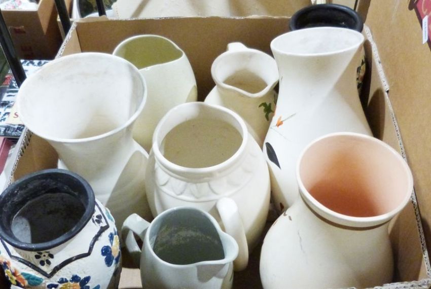 Prinknash brown glazed jug with five cups, a smaller jug, a vase, a set of six Prinknash cups and saucers, a large jug and a smaller jug in black glaze, an Ellgreave 'Rhapsody' vase, an Ellgreave 'Gayline' vase, a Brentleigh ware Sundown vase and assorted chinaware (5 boxes)