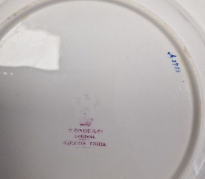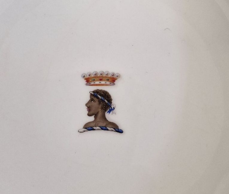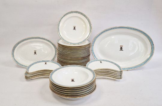 19th century MInton's china part dinner service with central Annesley family, Oxfordshire crest, crowned African head with turquoise and gilt borders, to include 19 dinner plates, seven soup bowls, two oval serving dishes and 11 salad crescents, with T Goode & Co, London puce mark Provenance: Formerly at Bletchington Park, seat of the annesley family