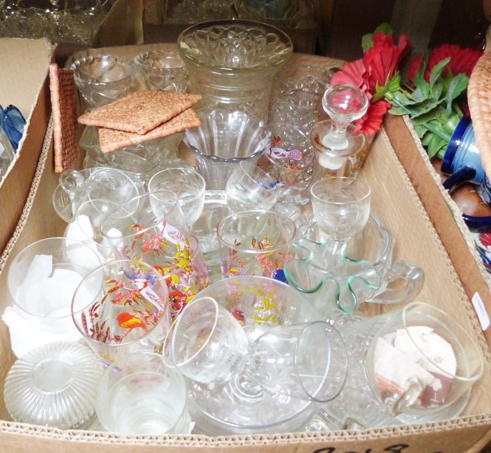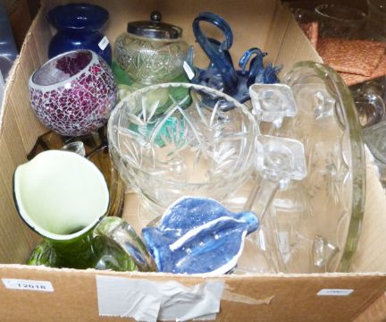 London pottery lidded trinket dish, a glass model of a swan and cygnet and various glass and chinaware (3 boxes)