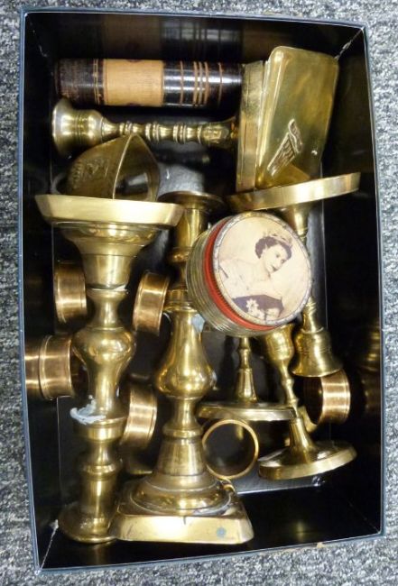Boxed set of Martel horse and jockey commemorative cognac glasses, three pairs of brass candlesticks, a Woods & Sons 'Yuan' part tea service and various china and metalware (3 boxes)