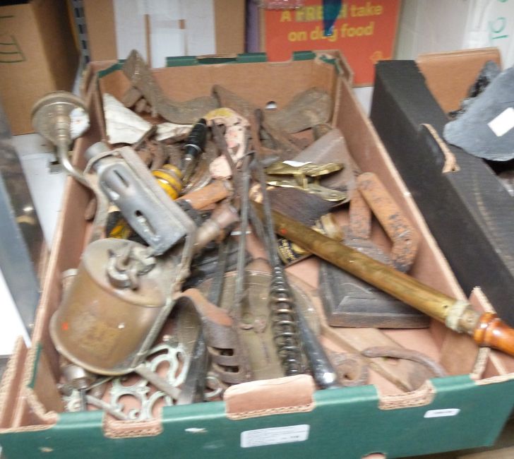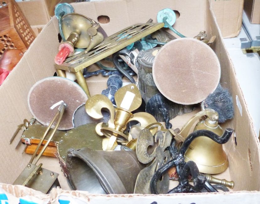 Collection of carved wooden animal models to include ducks, fish, hippos, etc and a quantity of assorted brass items to include fleur-de-lys shaped sconces, candlesticks, etc (3 boxes)