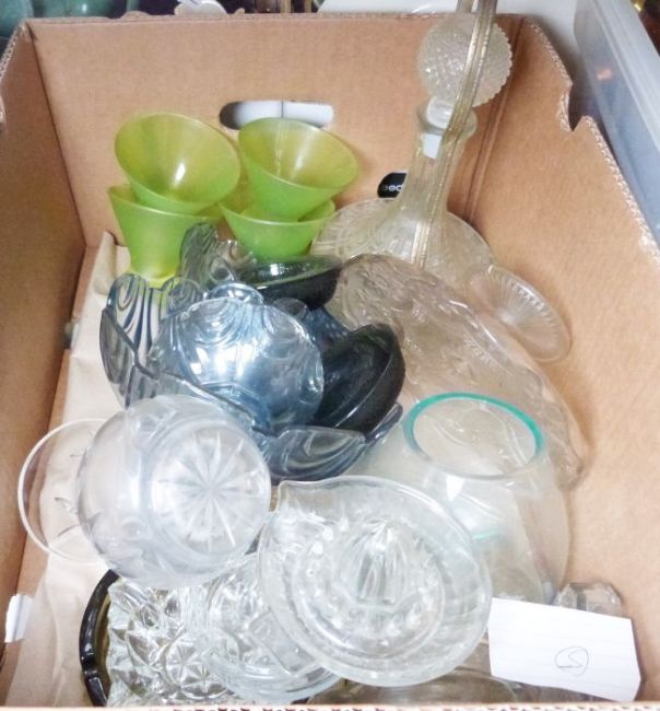 Various glassware to include carnival glass style, moulded glass, pyrex, various plates, bowls, mugs, etc (5 boxes)