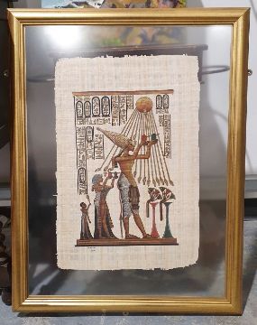 Coastal landscape, unsigned and unframed (35 x 46cm) and four modern Egyptian paintings on papyrus, framed and glazed (6)