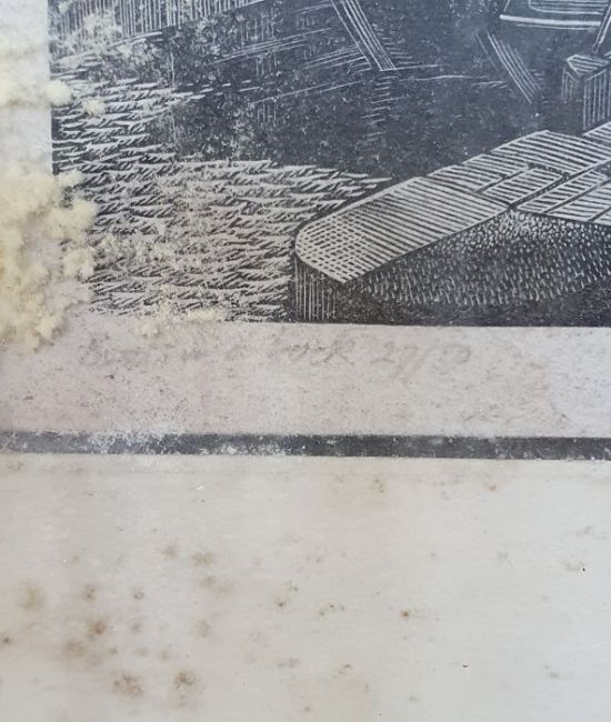 George MackleyWoodcutNo.27/50, signed and titled in pencil in margin, woodcut is damaged on the edges with damp and mould, framed, approx. 15cm x 12.5cm (io)