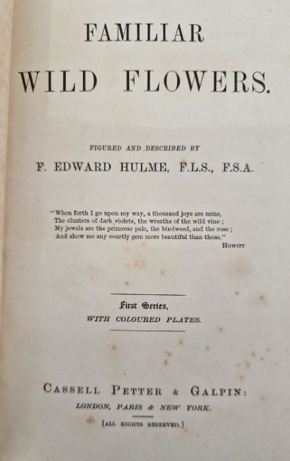 Hulme, F Edward"Familiar Wildflowers", 1st series, Cassell Petter & Galpin, colour plates with tissue guards, vols 1, 2 and 4 hinges cracked, vol 2 has pages beginning to separate (page 42) and one plate has separated, vol 4 page 92 and subsequent plate beginning to separate, some very light toning, plates not affected, original publishers pictorial cloth showing a white anemone on front boards, all edges red speckled (4)