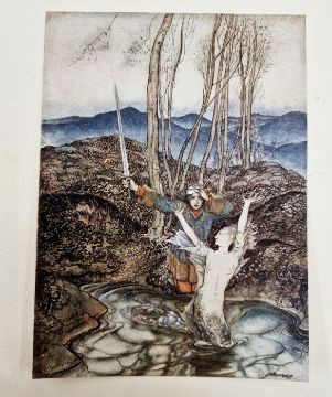 Rackham, Arthur (ills)"Some British Ballads", Constable & Co [1919], colour frontis tipped in with lettered tissue guard, plate is creased bottom right hand corner, no.293/575 numbered and signed copies signed by the artist 'Arthur Rackham', orignal vellum backed boards, gilt titles. some offsetting to the half-title and the limited ep (see image), offsetting to ep, colour frontis, colour plates tipped in with lettered tissue guards, illustrated headers to each ballad, hinges cracked, boards are stained, corners and edges all bumped, backstrip has bruising at the base