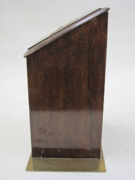Edwardian brass-mounted manor house letterbox, the sloping front with pierced brass letter aperture, lockable glazed door to the front, with inscription 'Post Leaves AM 8.30, Noon PM 4PM, 6PM', on brass base, 29.5cm x 27cm