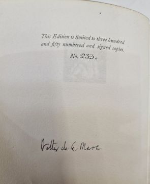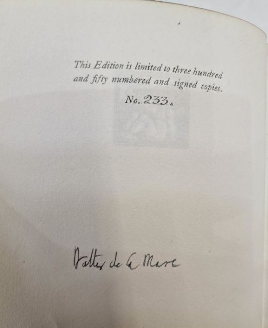 Cole, G D H & Margaret (ed)"Rural Rides ... Tours in Scotland ... Letters from Ireland ...", William Cobbett, London Peter Davis 1930, limited edition to 1000 sets, not numbered, 2 vols only out of 3, numerous vignettes by John Nash, ep and map of Cobbett's country by A E Taylor, marbled boards, quarter cloth, black pastedown with gilt titles, t.e.g.Cole, G D H (ed)"A Tour Thro' the Whole Island of Great Britain ... by Daniel Defoe, Gent", Peter Davis 1927, limited edition of 1000 copies for sale, not numbered, 2 vols only, marbled boards, vellum backstrip, t.e.g.Walter De La Mare "Stuff and Nonsense", Constable & Co 1927, no.52/275 numbered and signed copies by the author, signed in ink Walter De La Mare, grey boards"An Inward Companion", Faber & Faber 1950, inscription dated 1950 on ffep, dj"O Lovely England and Other Poems", Faber & Faber 1953, green cloth, dj not price clipped"Poems 1901-1918", Constable & Company Ltd 1920, with "Poems 1919-1934", Constable & Co 1935, grey cloth with gilt titles, dj to vol 2 "Come Hither ...", Constable & Co 1923, limited edition 233/350 numbered and signed copies, signed Walter De La Mare in ink, two bkpls inside front board "Come Hither", vol 2 1923, engraved vignette on 2nd ffep, bkpl inside front board, grey boards with quarter cream cloth and pastedown titles, backstrips rather sunned "Crossings, a Fairy Play", with drawings by Gwendoline Raverat, Faber & Faber 1952, pictorial ep, pictorial front board "Peacock Pie", Faber & Faber "Songs of Childhood", decorations by Marion Rivers-Moore 1952, Faber & Faber, blue cloth (14)