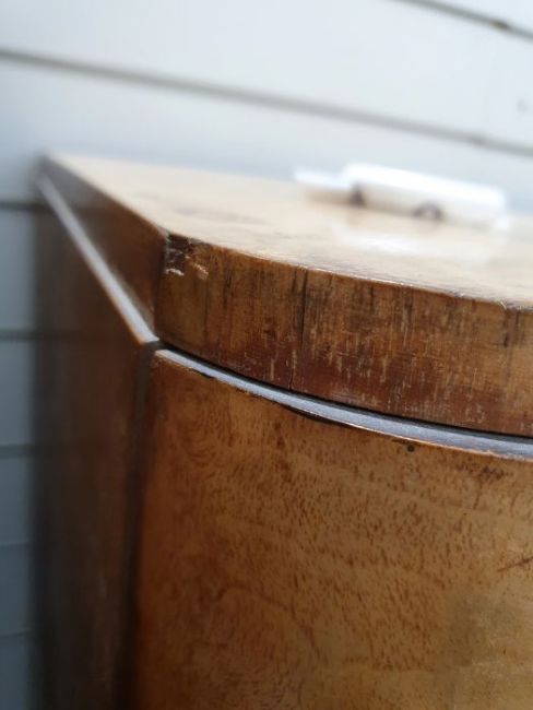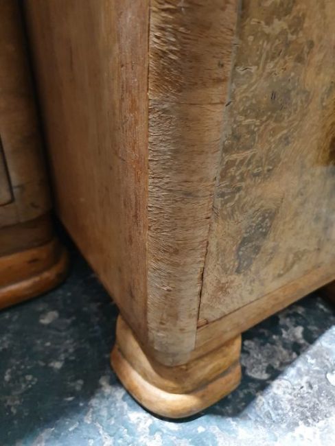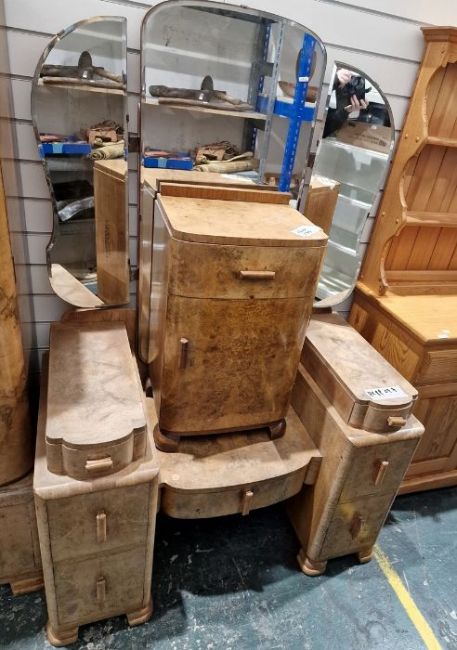 Early 20th century Art Deco walnut bedroom suite to include three-door wardrobe, compactum, dressing table with three part mirror and side cupboard (4) Condition ReportSmall wardrobe with surface scratches, scuffs and knocks.  Splits and areas of loss to the veneer. Fading and discolouration in places. H. approx 161cm, W. approx 86cm, D approx 48cmSide cupboard with surface scratches, scuffs and knocks.  Splits and areas of loss to the veneer. Fading and discolouration in places, wear to veneer, H. approx 71cm, W. approx 44cm, D. approx 33cmDressing table with surface scratches, scuffs and knocks.  Splits and areas of loss to the veneer. Fading and discolouration in places, some of the handles are loose.  H. approx 161cm, W. approx 109cm, D. approx 57cmAll with general wear and tear.
