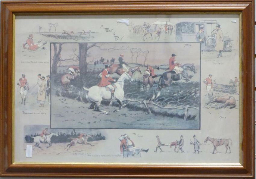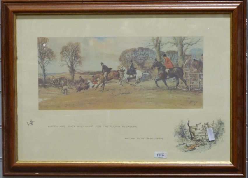 After Snaffles (Charles Johnson Payne)"Happy Are They Who Hunt for their Own Pleasure and Not to Astonish Others", printed signature in margin, 42cm x 60cm approx. and another "And Point to Point" with various vignettes in the margin, glazed and framed (2)