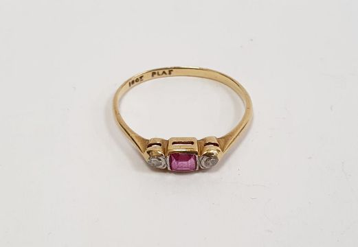 18ct gold, ruby and diamond ring set centre baguette-cut ruby flanked by pair collet-set small diamondsCondition ReportSize N/O