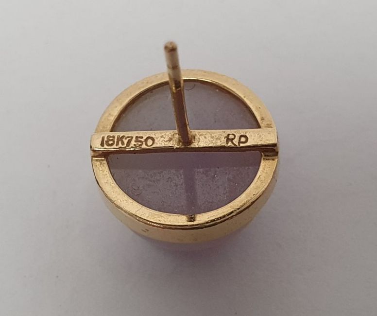 18k yellow gold ring set with a polished cabochon chalcedony, stamped 750, 18k, approx. 5g and a pair of 18k stud earrings set with polished cabochon chalcedony-type stones Condition ReportThe ring size is between N and O overall condition appears to be good