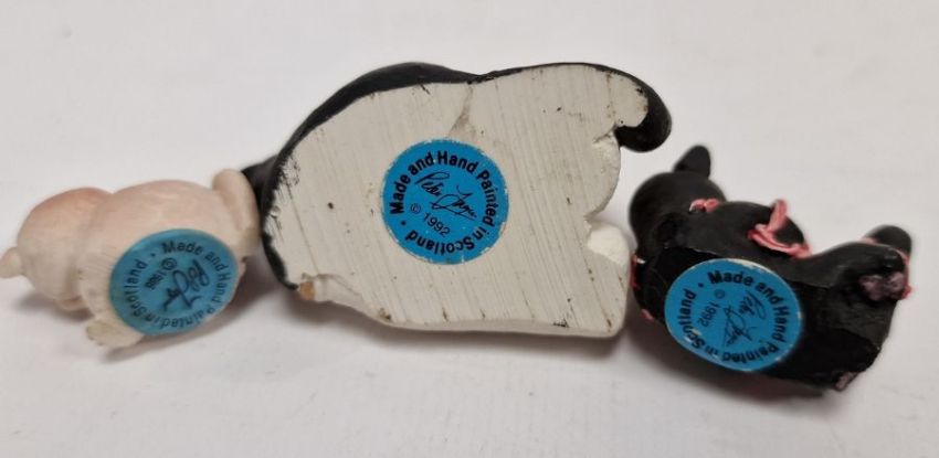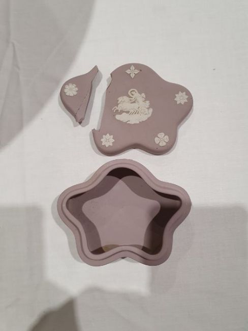 Light surface scratches, accretions. Lid of trinket box is broken.  Repair to the ear of Pigling Bland model. Both handles are broken on the BFA cat basket.  General wear and tear.