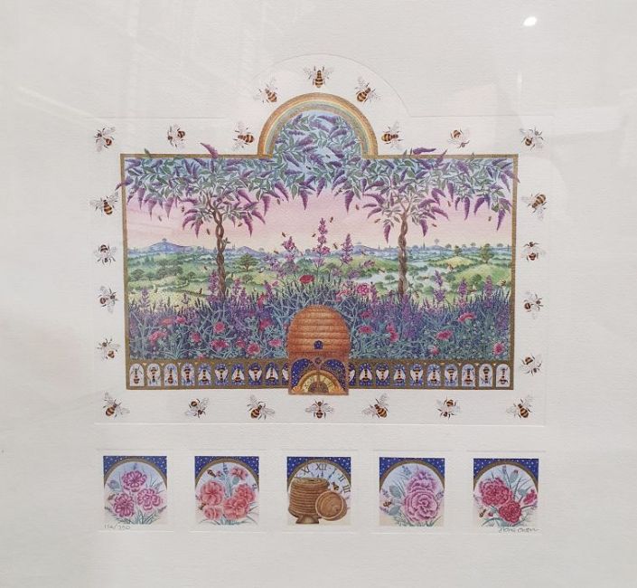 After Fiona Owen (Chalford, Glos) Limited edition colour printStudy of a beehive, with vignettes of bees around the margin and vignettes of carnations, etc, with gilt illumination, 156/750, signed lower right, framed, 60cm x 50cm