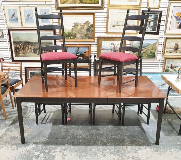 20th century Canadian stained maple extending table and six ladderback boardroom chairs (7)