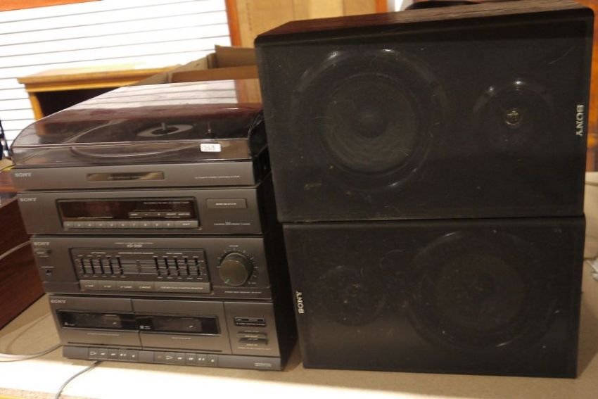 Sony hifi system, model no. XO-D101SCD and speakers and a box of LPs to include Johnnie Cash, Frank Sinatra, Shirley Bassey, etc