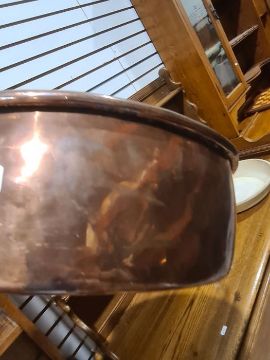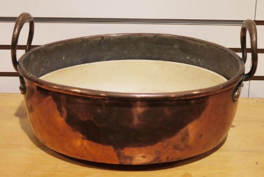 Large antique copper two-handled shallow pan, 40cm diameter x 17cm deep
