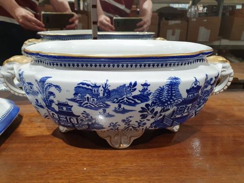 Quantity of Wedgwood 'Gold Chelsea' chinaware to include cups and saucers, bowls, side plates, gravy boat, etc, a set of six John Tams dinner plates, a pair of Stavingerflint Norway side plates, a late 19th century Royal Worcester lidded tureen with Chinese decoration, a Jars France jug and further assorted china and glassware (2 boxes)