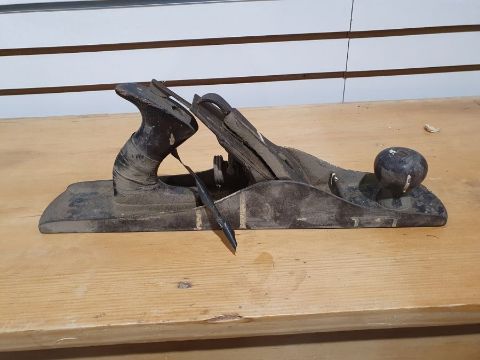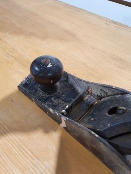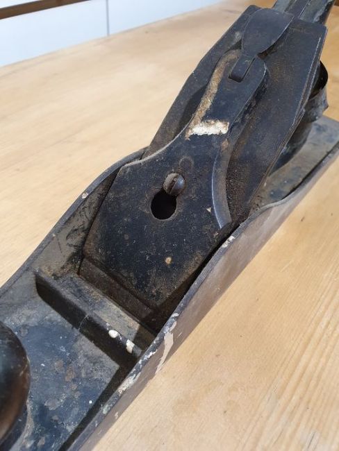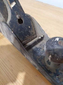 Metal plane marked "Bailey" with scratches, dust, accretions, some rust in places, general wear and tear.